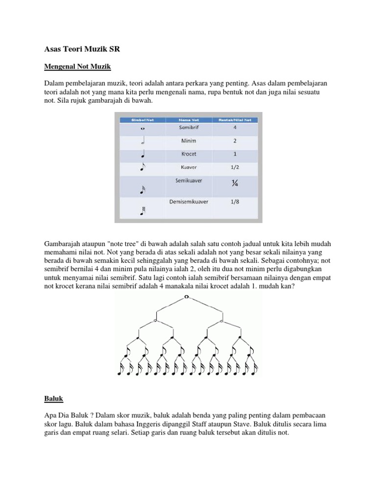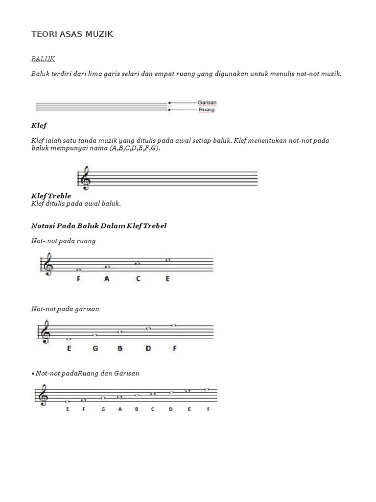 Menamakan jenis dan nilai not serta boleh mengaplikasikannya melalui aktiviti latihan yang disediakan 2. Teori muzik Asas Teori Muzik. Baluk terdiri dari lima garis selari dan empat ruang yang digunakan untuk menulis not-not muzik.